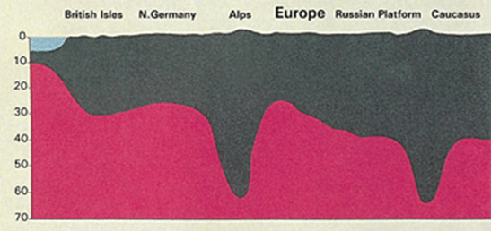 Figure 2: Schematic section. The mountains, like pegs, have deep roots embedded in the ground. (Anatomy of the Earth, Cailleux, p. 220.)