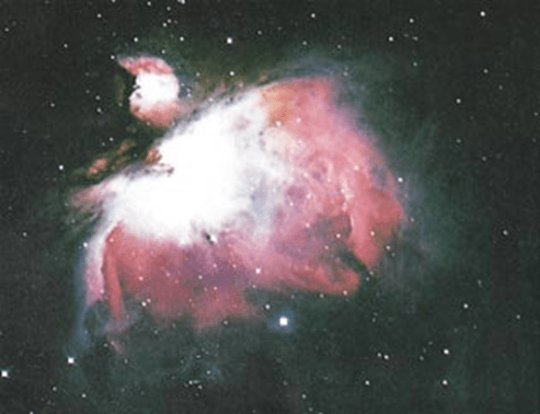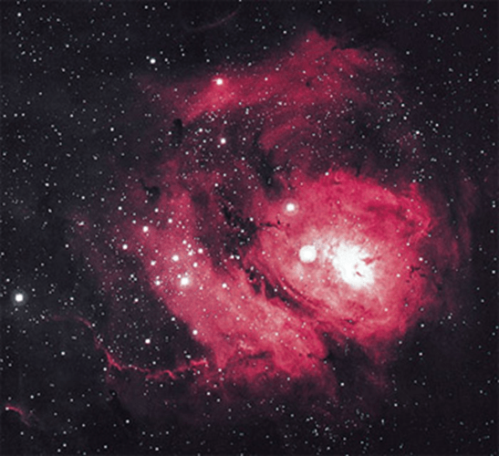 Figure 2: The Lagoon nebula is a cloud of gas and dust, about 60 light years in diameter. It is excited by the ultraviolet radiation of the hot stars that have recently formed within its bulk. (Horizons, Exploring the Universe, Seeds, plate 9, from Association of Universities for Research in Astronomy, Inc.)