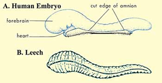 Figure 1: Drawings illustrating the similarities in appearance between a leech and a human embryo at the alaqah stage. (Leech drawing from Human Development as Described in the Quran and Sunnah, Moore and others, p. 37, modified from Integrated Principles of Zoology, Hickman and others. Embryo drawing from The Developing Human, Moore and Persaud, 5th ed., p. 73.)
