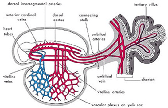 Figure 4: Diagram of the primitive cardiovascular system in an embryo during the alaqah stage. The external appearance of the embryo and its sacs is similar to that of a blood clot, due to the presence of relatively large amounts of blood present in the embryo. (The Developing Human, Moore, 5th ed., p. 65.)