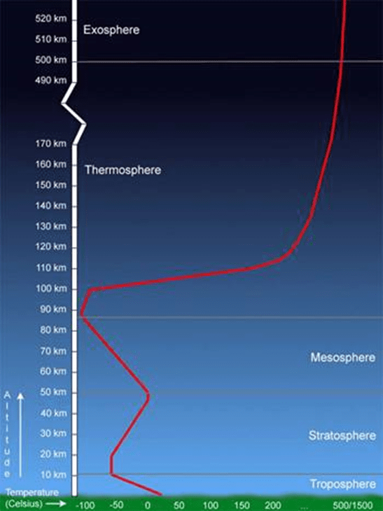 This image shows the average temperature profile through the Earth’s atmosphere. Temperatures in the thermosphere are very sensitive to solar activity and can vary from 500°C to 1500°C. Source: Windows to the Universe, (http://www.windows.ucar.edu), the University Corporation for Atmospheric Research (UCAR). ©1995-1999, 2000 The Regents of the University of Michigan; ©2000-04 University Corporation for Atmospheric Research.